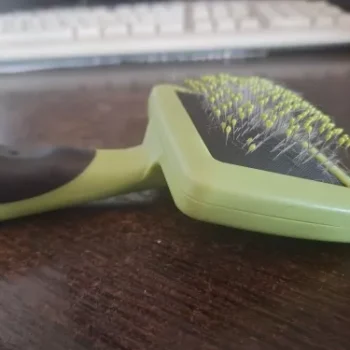 I have a Golden Retriever, and anyone who owns one knows how much they shed. I've tried various brushes, combs, and grooming tools but nothing seemed to do the trick until I stumbled upon this product. Not only does it effectively remove loose hair from my dog's undercoat, but it also untangles any knots without causing him discomfort. The added bonus is that it doubles as a massage brush! My dog absolutely adores the gentle strokes of this tool on his skin — he even falls asleep sometimes while being groomed. It’s easy to clean too which makes maintaining hygiene quite effortless.